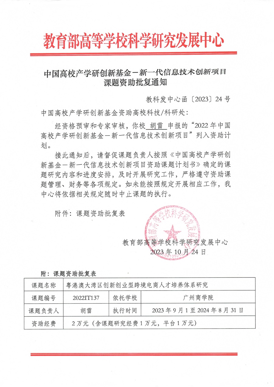 近日,教育部高等学校科学研究发展中心发布了“2022年中国高校产学研创新基金-新一代信息技术创新项目”的资助通知,太阳集团tyc4633胡雷老师申报项目《粤港澳大湾区创新创业型跨境电商人才培养体系研究(2022IT137)》成功立项。
