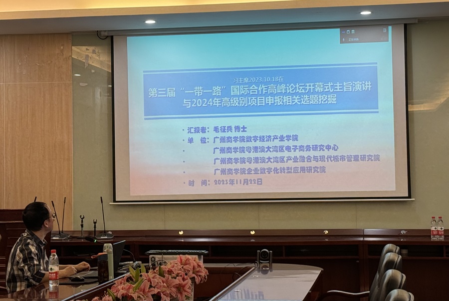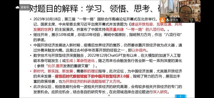 毛博士的分享题目为《习近平主席2023.10.18在第三届“一带一路”国际合作高峰论坛开幕式主旨演讲与2024年高级别项目申报相关选题挖掘》,通过对《建设开放包容、互联互通、共同发展的世界——在第三届“一带一路”国际合作高峰论坛开幕式上的主旨演讲》进行全文学习,领会其精神,并从中挖掘科研选题,把握研究方向。毛博士对文件进行深度思考,挖掘出包括开放经济、国际合作、人工智能、鲁班工坊、民间交往等在内的三十个研究方向,为公司教师的高水平论文的写作发表以及高级别项目的申报提供了灵感来源。