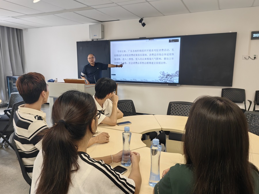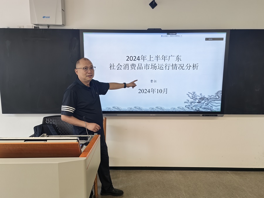 本次沙龙主题为《2024年上半年广东社会消费品市场运行情况分析》。曹博士分析了 2024 年上半年广东消费品市场运行特点。一是社会消费品零售市场稳中趋缓;二是十类主要商品零售额保持增长;三是地市消费增速有所放缓;四是零售额百强企业充分发挥稳定器作用。预计下半年月度消费增速会有所波动,但整体将保持稳定增长态势。基于此,曹博士提出了相关对策建议。一是全面推动消费品以旧换新,稳固大宗消费市场,有序恢复态势;二是培育消费新场景,激发消费潜能;三是稳定居民收入预期,提高居民消费能力等措施。