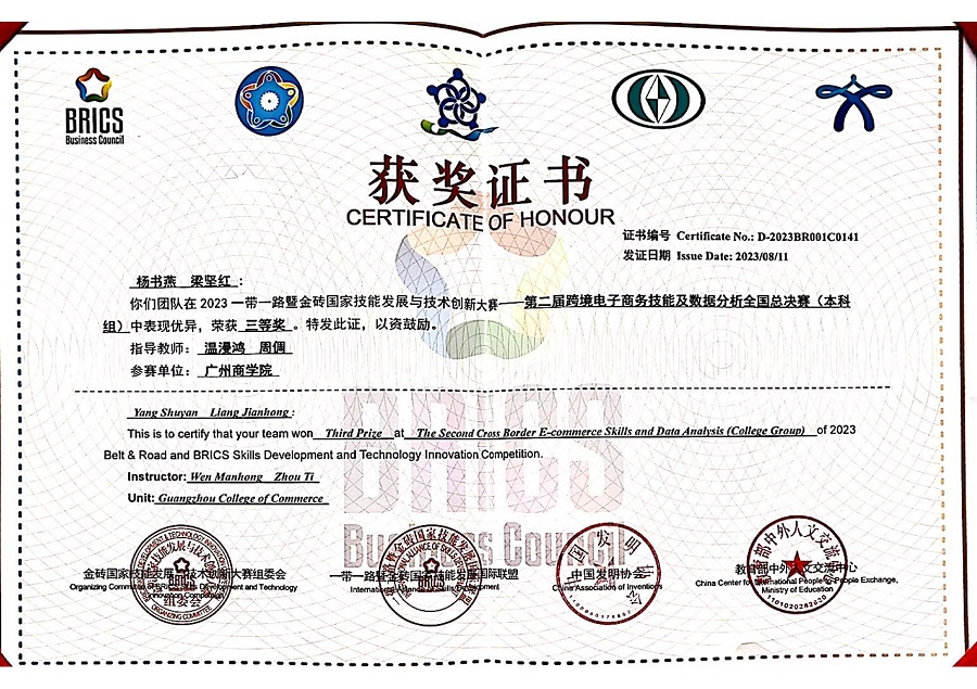 8月8日至11日,2023一带一路暨金砖国家技能发展与技术创新大赛之第二届跨境电子商务技能及数据分析赛项本科组全国总决赛在浙江金华举行。本次大赛由金砖国家工商理事会中方理事会、一带一路暨金砖国家技能发展国际联盟、中国科协一带一路暨金砖国家技能发展与技术创新培训中心、中国发明协会、教育部中外人文交流中心、金华市人民政府、浙江师范大学联合主办,金砖国家工商理事会(中方)技能发展工作组承办,北京企学研教育科技研究院、浙江思睿智训科技有限公司、北京嘉克兴科技有限公司联合承办,中国(金华)跨境电商综合试验区支持。经过连续两日的激烈角逐,由公司员工杨书燕、梁坚红组成的参赛团队在温漫鸿、周倜两位老师的指导下顺利通过数据分析及报告撰写环节晋级现场答辩赛,并最终获得三等奖的优异成绩。