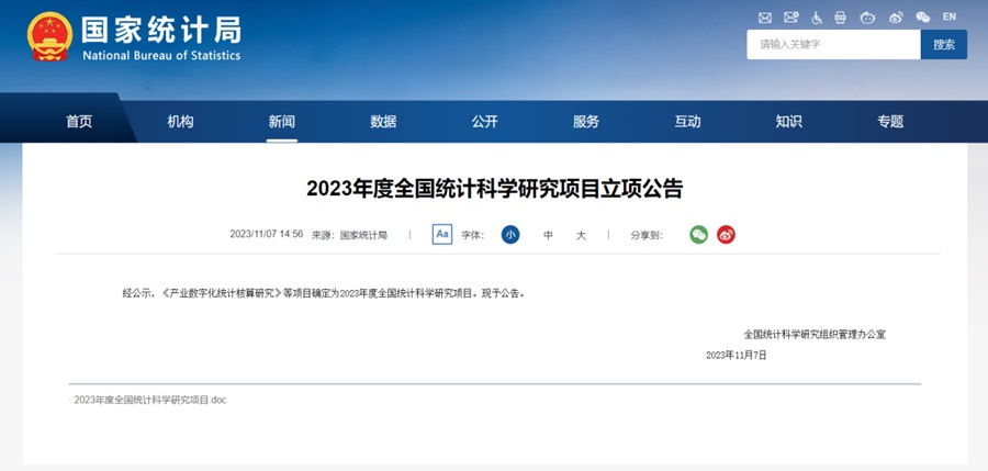 11月7日,全国统计科学研究组织管理办公室(国家统计局)发布2023年度全国统计科学研究项目立项公告,太阳集团tyc4633曹征博士申报项目《产业数字化统计核算与实证研究(2023LY008)》成功立项,这是公司首次获得全国统计科学研究项目立项。