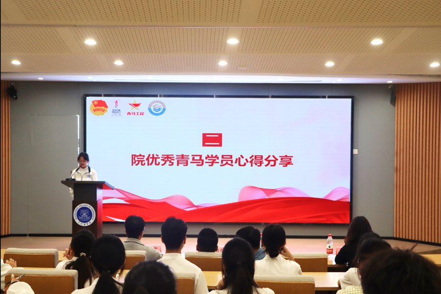 本次“青马工程”培训班开班仪式在庄严的团歌中拉开帷幕。学院往届青马工程优秀学员陈筱盈同学发言。她首先分享了在学院青马工程培训班中经过理论学习与实践锻炼的巨大收获,并表示希望青马学员们能够珍惜机会,在学习的过程中积极主动思考,牢记使命担当,做有理想信念,有思想厚度,有使命意识,有创造活力,有担当能力的新时代青年。