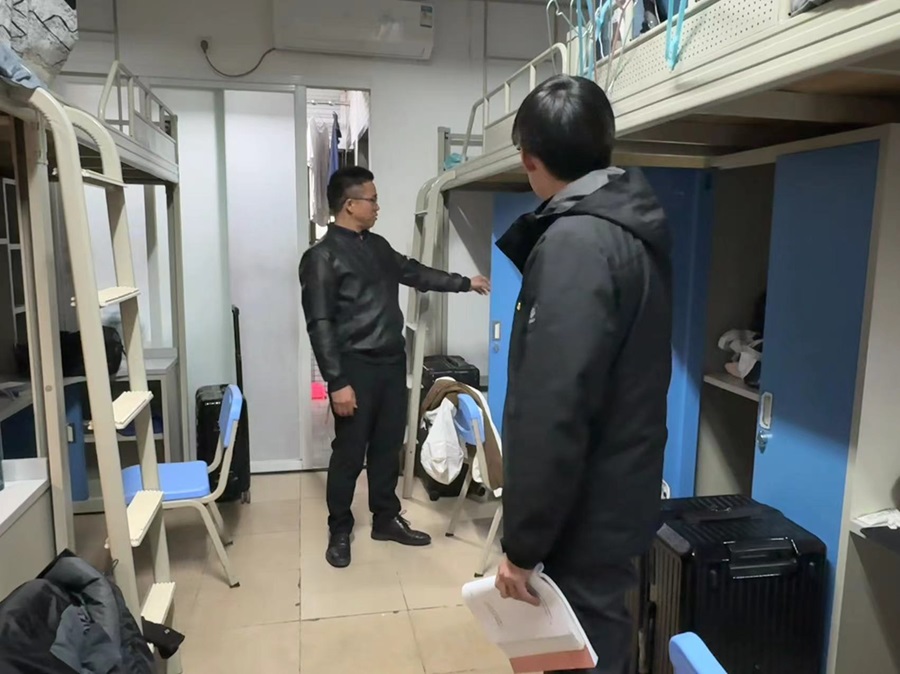 检查过程中,老师们与员工亲切交流,了解员工近期的学习、生活状态,并为在宿员工讲解消防安全知识,教导员工规范使用用电设备,同时叮嘱同学们要加强宿舍学风建设,遵守宿舍管理规定,注意防火防盗,注意防寒保暖,勤开窗通风,保持空气流通和卫生整洁。