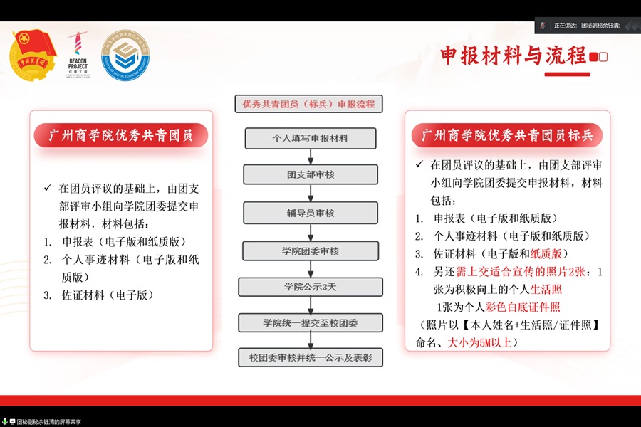 余钰清作开场共青团组织 “五四评优”的讲解,她将讲解内容分为时间安排、参评条件、申请材料与流程、注意事项四个部分,详细说明了各阶段的工作规划、细化参评条件和申请资料的规则及格式,以确保各项流程能够顺利进行。在注意事项中,她特别提出填报申报表要注意时间统一、教育实践专题、团籍注册情况、奖项等级的区分和i志愿注册比例等若干。