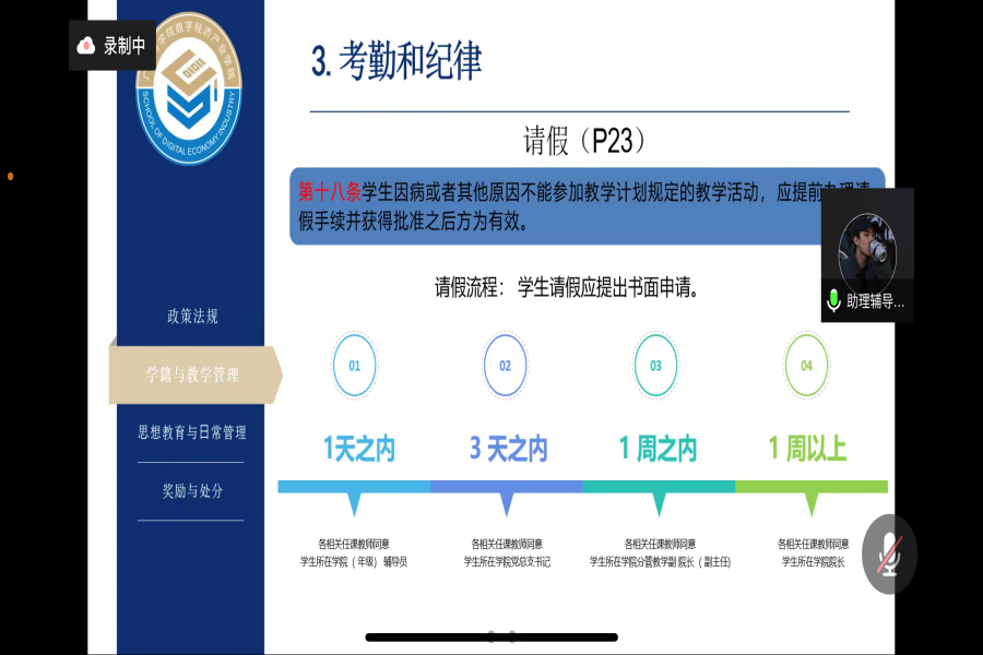 首先由黄子恒对《员工手册》基本内容进行讲解,他就政策法规、学籍与教学管理、思想教育与日常管理、奖励与处分四个模块详细介绍了校规校纪、宿舍内务规范、教学管理、考勤纪律、员工奖学金等相关内容。他强调助理辅导员应该对《员工手册》各方面内容有更充分的了解,从而更好地为新生提供服务。