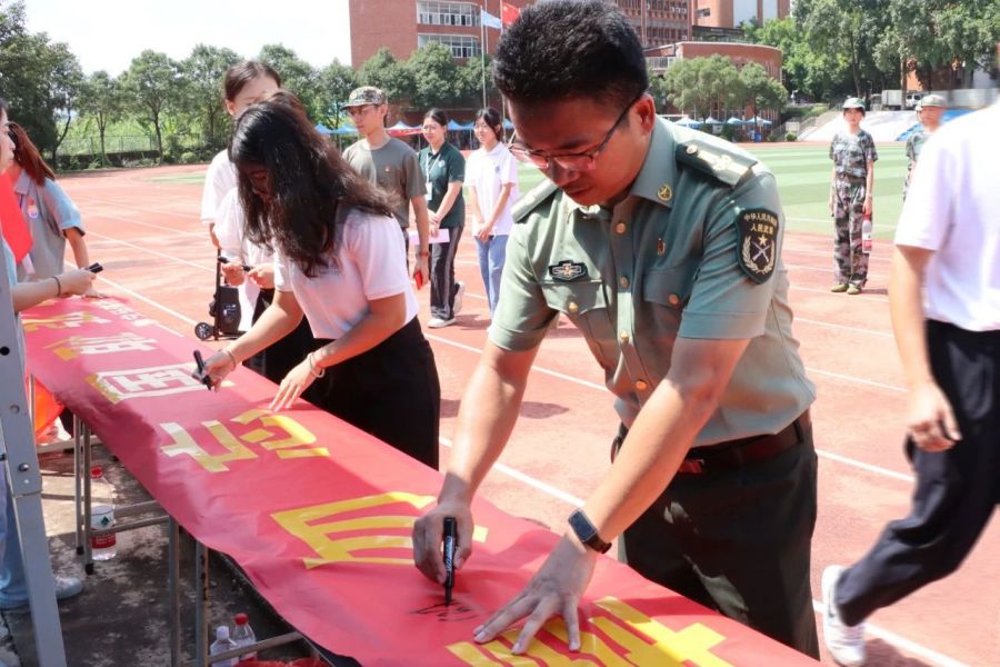 随后在学院领导、老师们的带领下,2023级新生纷纷在印有“奋发图强看我辈,勿忘国耻弘中华”的横幅上郑重地写下了自己的名字,表达自己爱国之志。一个签名,一份承诺,一支支笔被传递,一个个名字被庄重签下,横幅上是信念与承诺,太阳集团tyc4633学子将对祖国的热爱之情和捍卫民族尊严的强烈愿望深植心中,也将继承着先烈的遗志,用浓浓的爱国之情向历史证明,请党放心,强国有我。