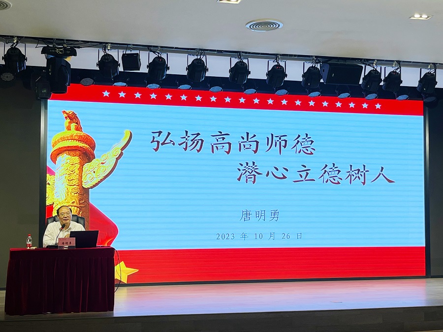 弘扬高尚师德,潜心立德树人。唐明勇指出师德师风直接影响教师队伍整体素质,关乎培养什么人、怎样培养人、为谁培养人这个教育的根本问题,关乎立德树人根本任务的落实。他围绕新时代、新变化、新思考三个关键词,对新时代师德师风建设面临的新变化、《新时代高校教师职业行为十项准则》的解读、新时代公司师德师风建设思考等三大内容进行了深入浅出的讲解与分析。他通过深入细致讲解党中央关于师德师风建设的重要指示和重要思想、列举师德优秀典型代表和部分违反师德师风的典型案例,具体阐释了什么是师德师风、什么是合格教师、什么是合格辅导员。