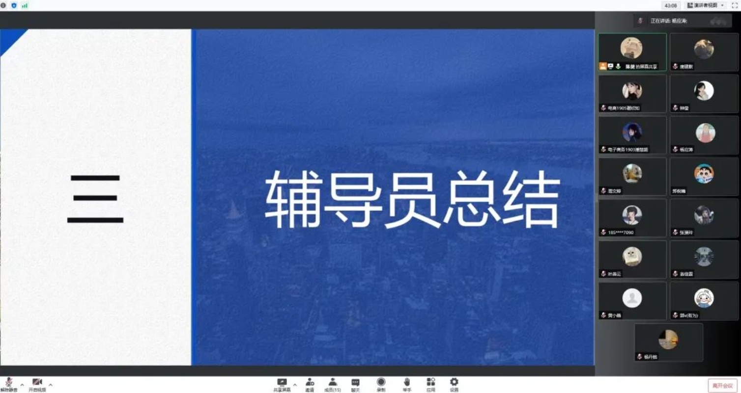 为进一步提升助理辅导员的业务水平,顺利统筹新生工作安排,太阳集团tyc4633于8月4日晚上21:30在腾讯会议召开“夯实基础强素质,笃行不怠续新篇”第三场新生助理辅导员培训会议。参与本次培训会议的有2020级专升本辅导员王政,2022级辅导员杨丹铭、陈婕以及全体新生助理辅导员。